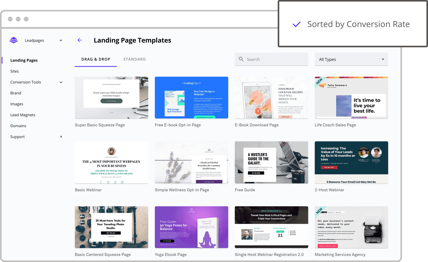 Not only can you filter templates by industry, page type, color, and style, but you can also sort them by conversion rate. This means you can find a template that both fits your business and helps you generate leads and sales.